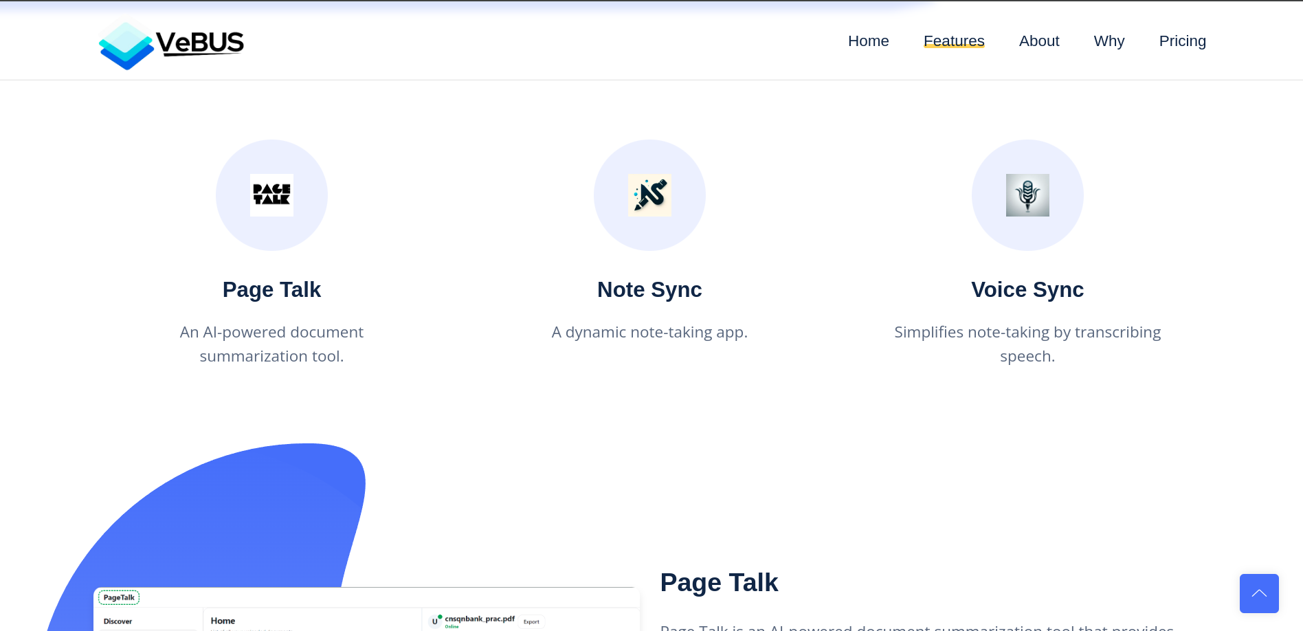 VeBUS (Very Effective Business Utility Suite) is an AI-powered productivity suite designed for individuals and businesses. It features PageTalk for chatting with PDFs and integrating conversations into NoteSync; NoteSync for dynamic, collaborative note-taking and automatic storage of Minutes of Meetings (MOMs); and VoiceSync for recording, transcribing, and summarizing meeting dialogues into MOMs.